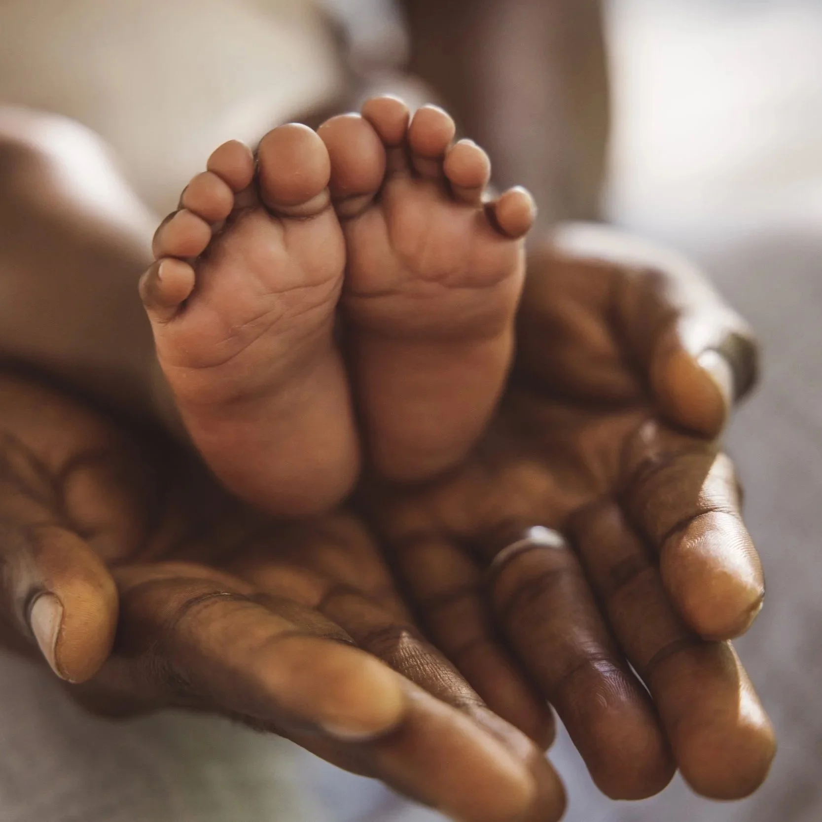 Closeup photos of Black dad's hands holding the feet of his newborn baby